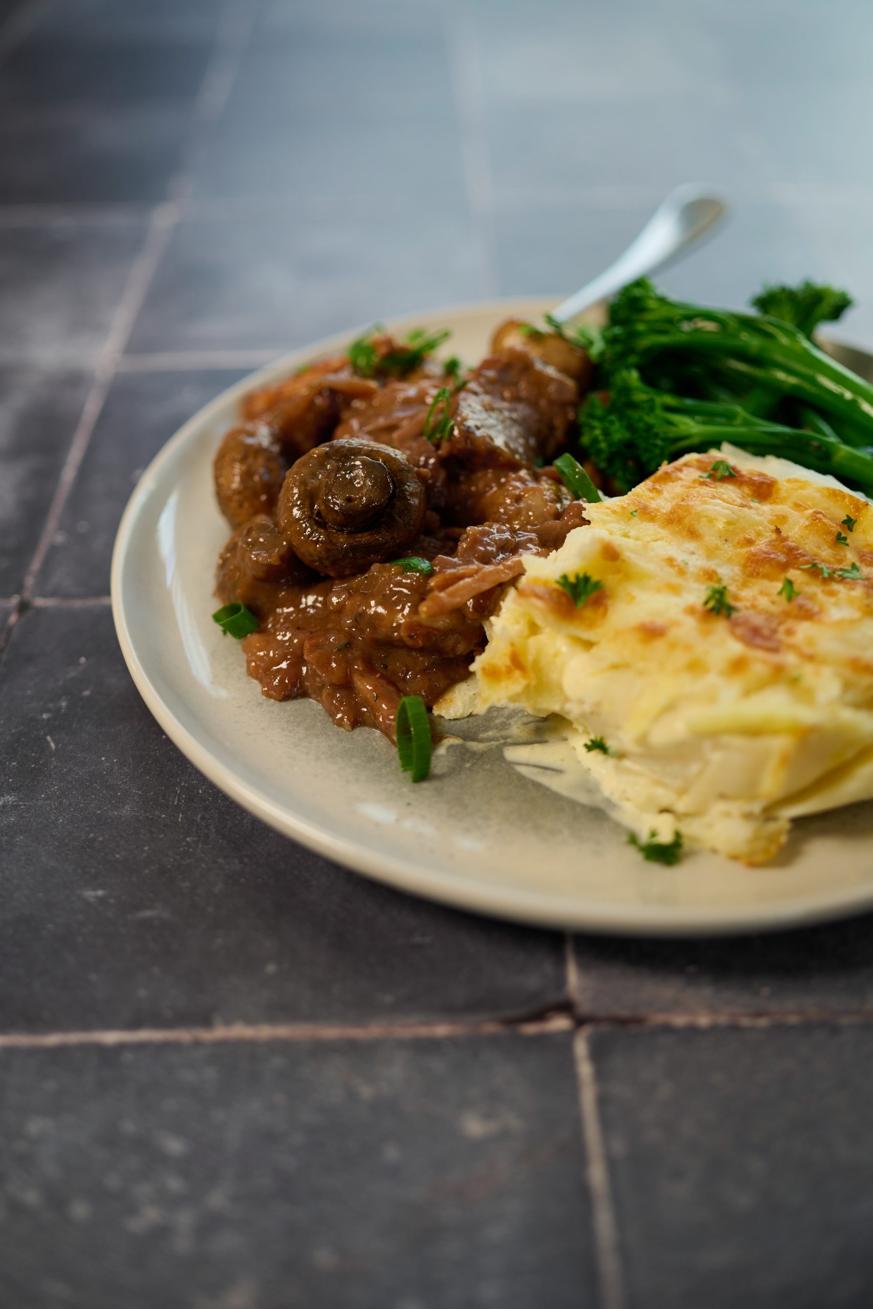 A French classic. Chicken braised in a rich red wine sauce with mushrooms, bacon and garlic. Served with a creamy potato gratin and gently steamed broccolini and French beans for some green goodness. And a scrumptious dessert to finish the meal on a sweet note.