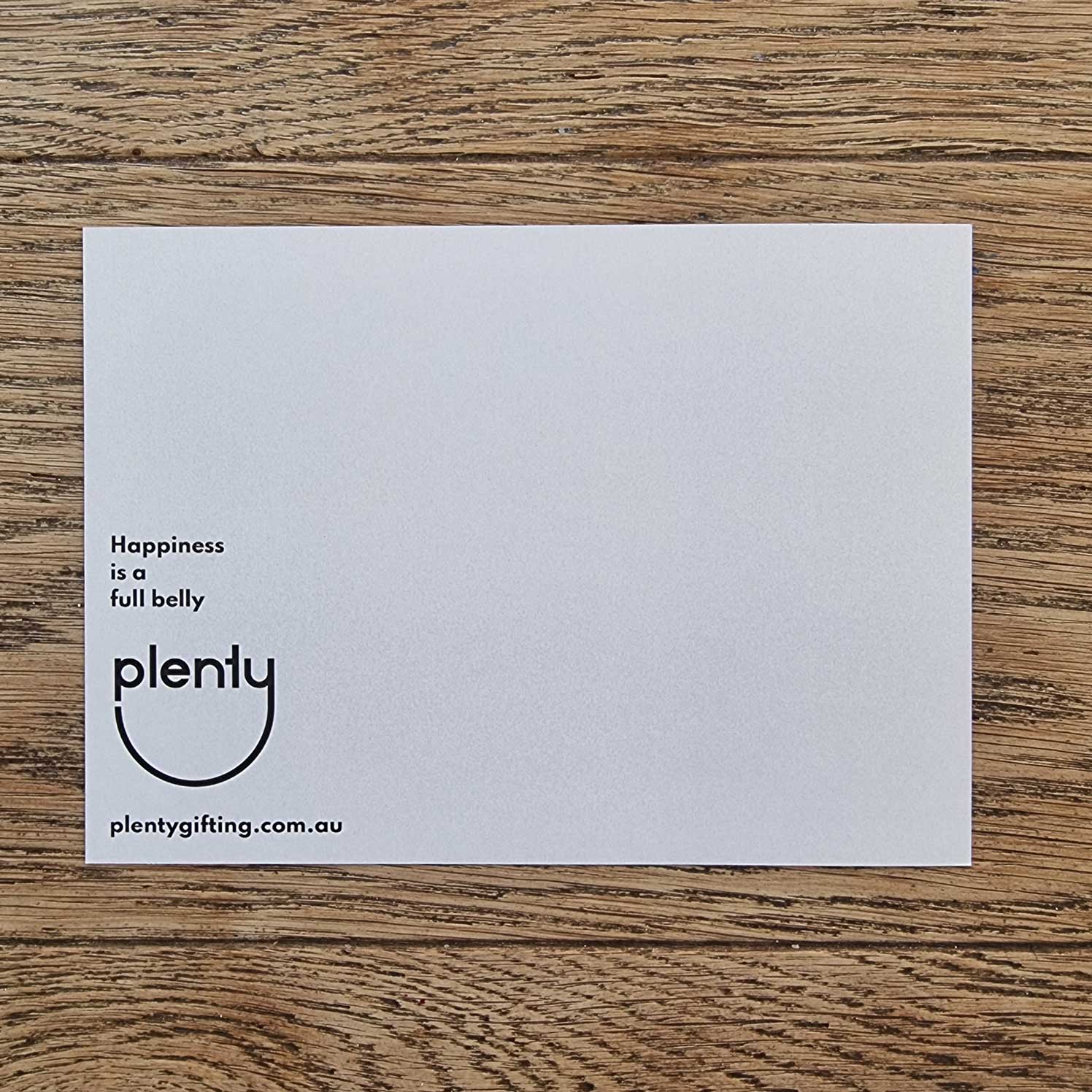 We have beautiful Plenty Gifting gift certificates customised with the details of your gift purchase, and plenty of room on the back for you to write a personal message.