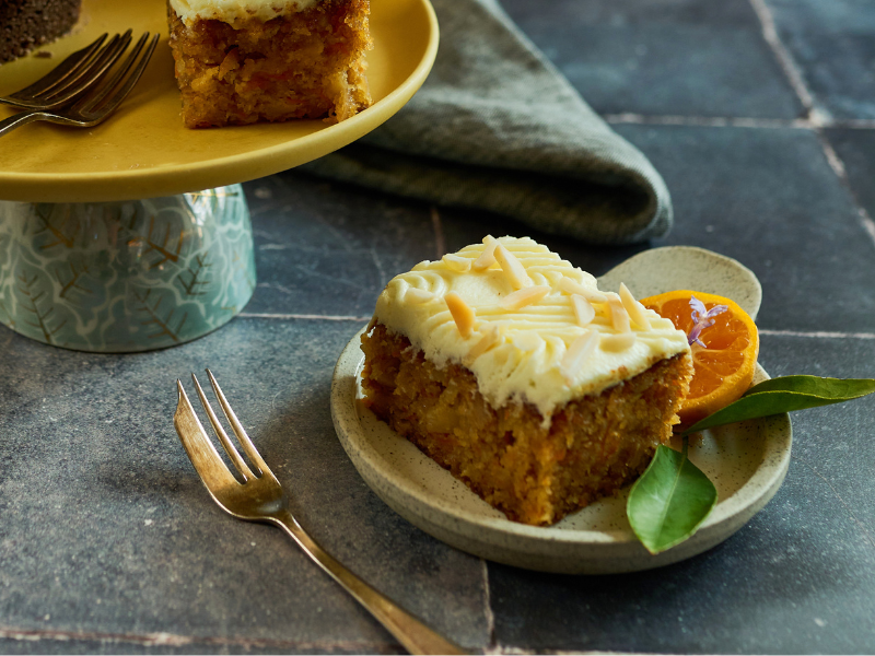 Carrot cake (GF): Carrot, ground almonds, rice flour, cornflour, eggs, sugar, pineapple, vegetable oil, walnuts, baking powder, bicarbonate soda, cream cheese (milk), butter (milk), icing sugar, vanilla essence (water, vanilla, colour 150d), lemon zest, lemon juice, dried apricots and slivered almond. Contains tree nuts, egg and milk products.