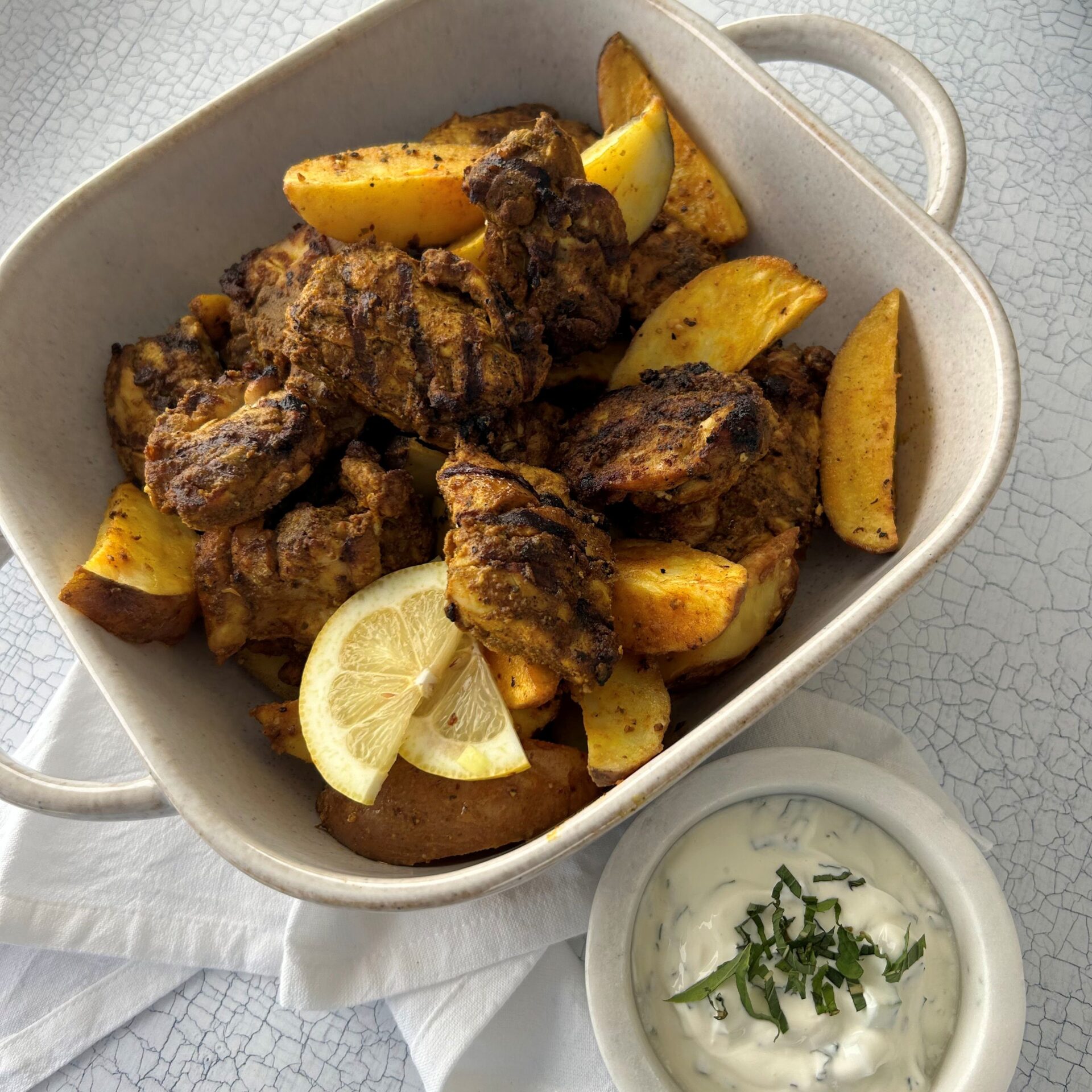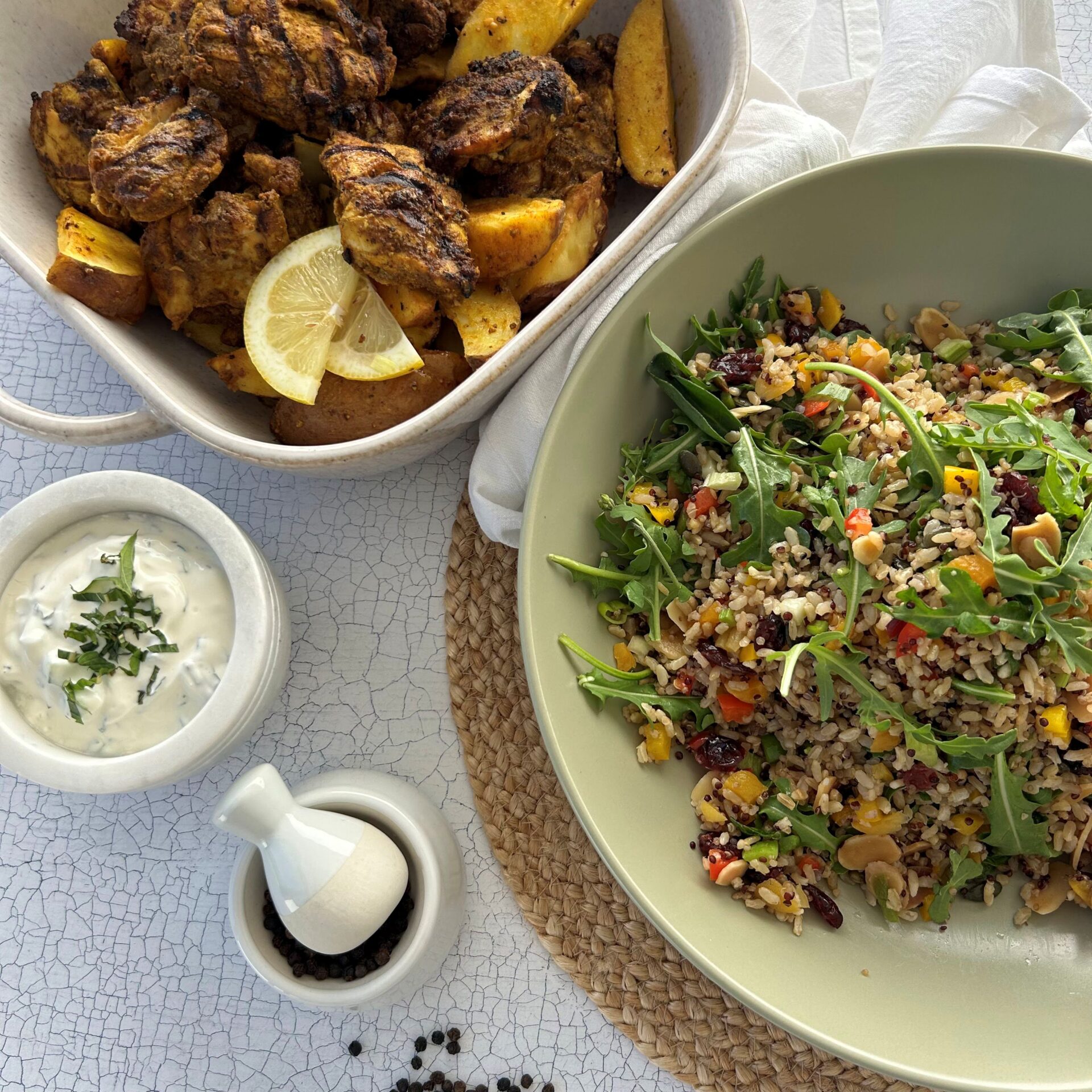 Oven-baked spiced chicken and potato served with a mint raita and brown rice, quinoa and rocket salad (GFO available on request)