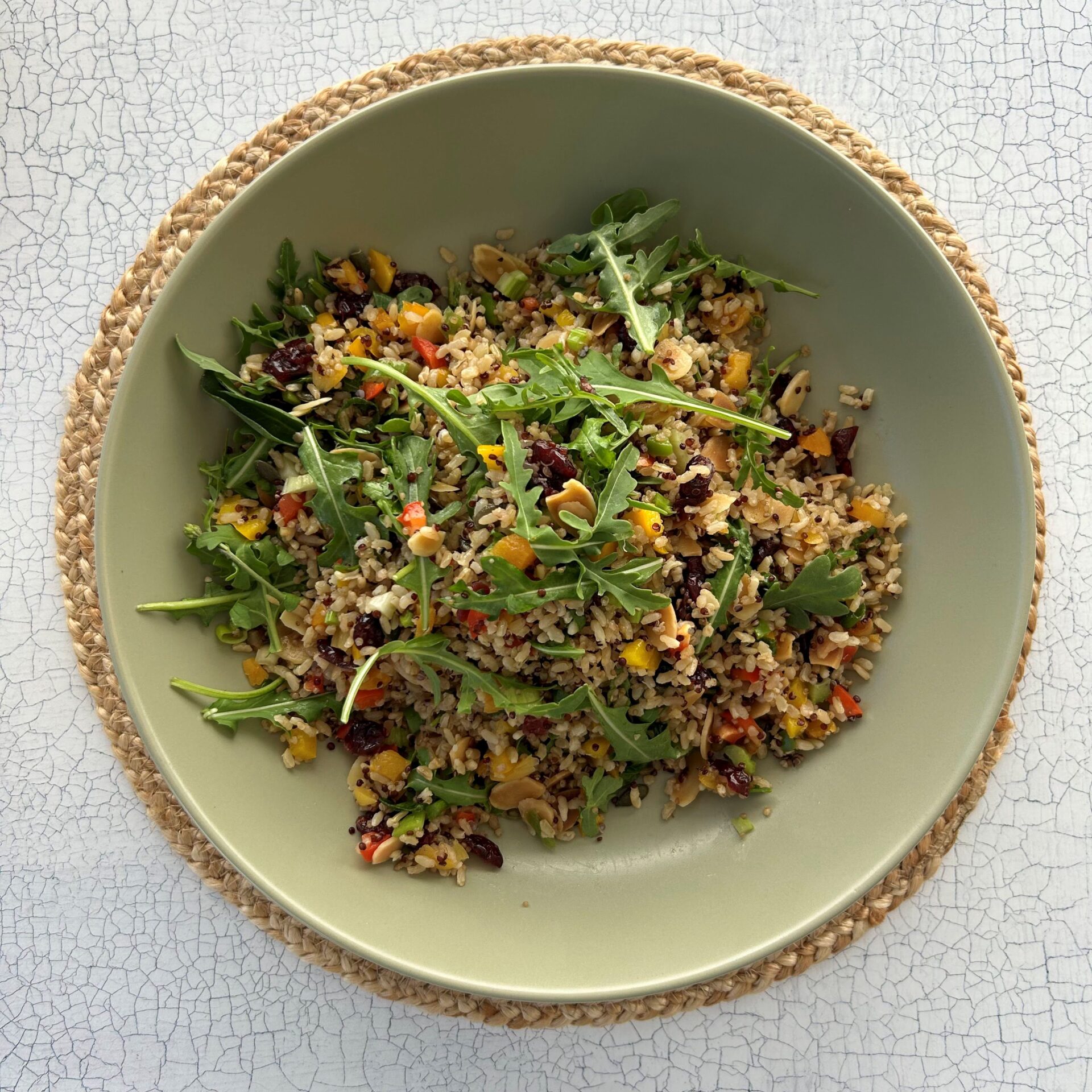 To prepare your brown rice, quinoa and rocket salad, toss the fresh rocket leaves through the rice and quinoa mixture in a large bowl.