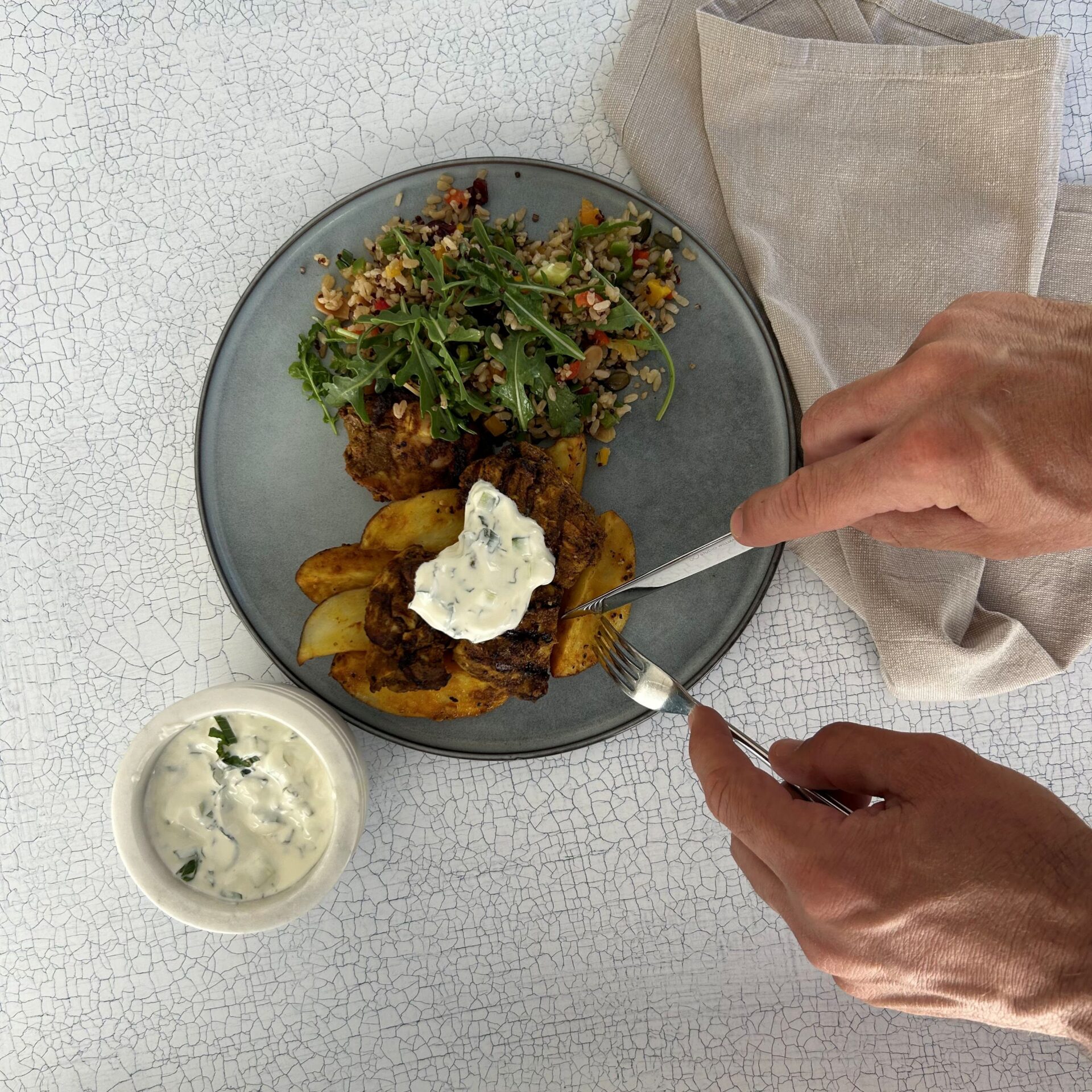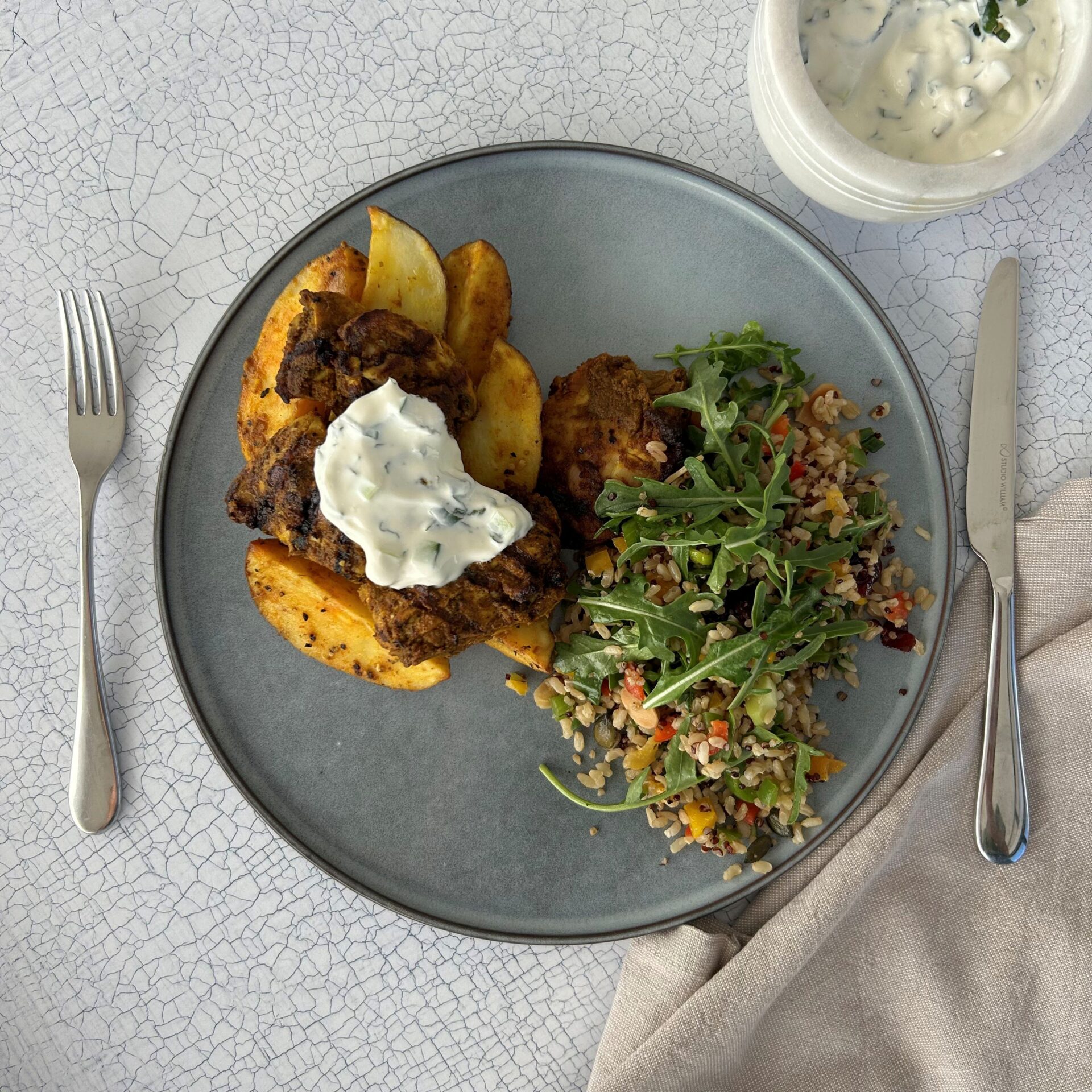 Once your chicken and potatoes are hot, plate them up and top with a dollop of minty raita and a side of your brown rice, quinoa and rocket salad. This should fill some bellies nicely.