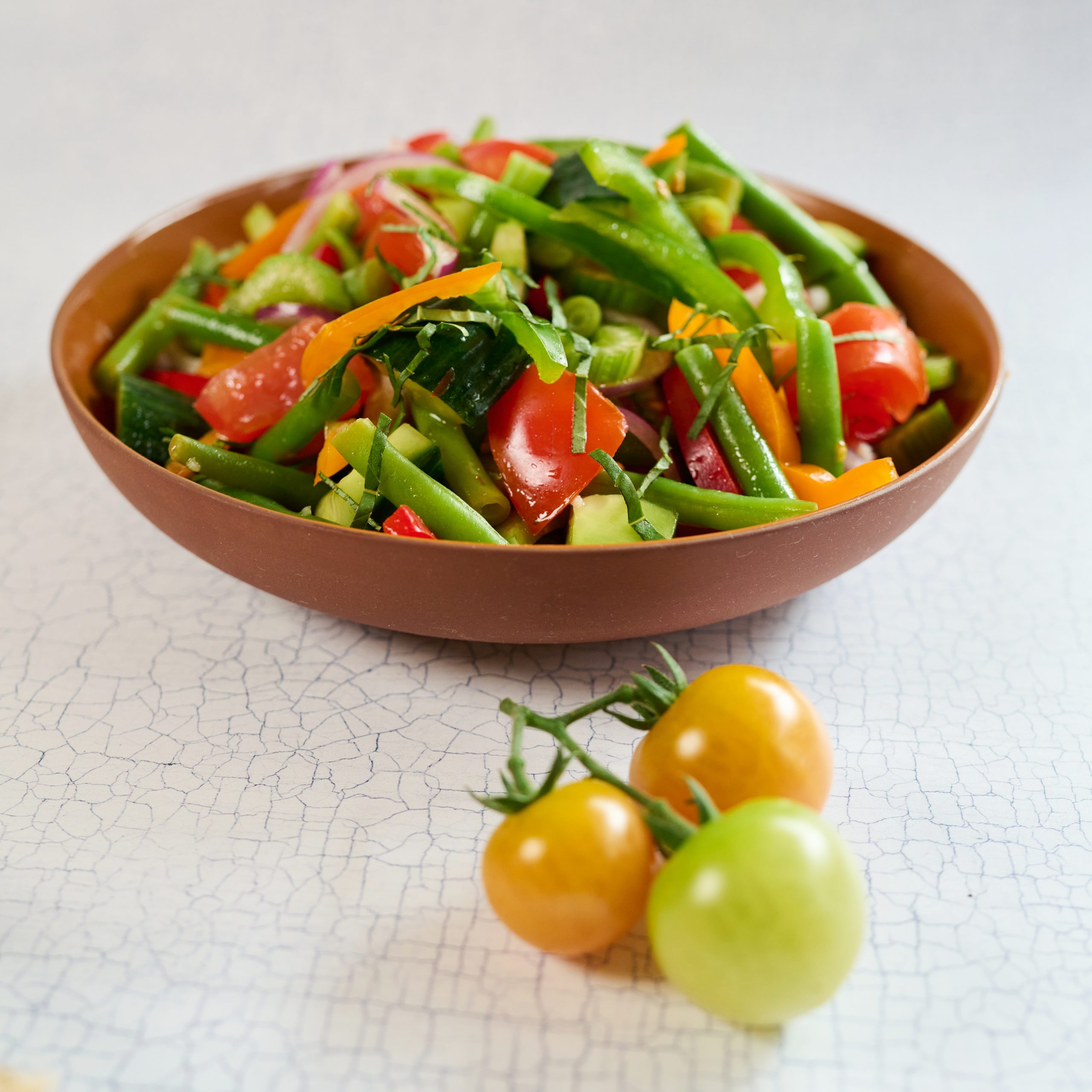 Plenty house salad (GF): Tomatoes, cucumber, green beans, red onion, capsicum, celery, salt, pepper, brown sugar, olive oil, vinegar, parsley, thyme