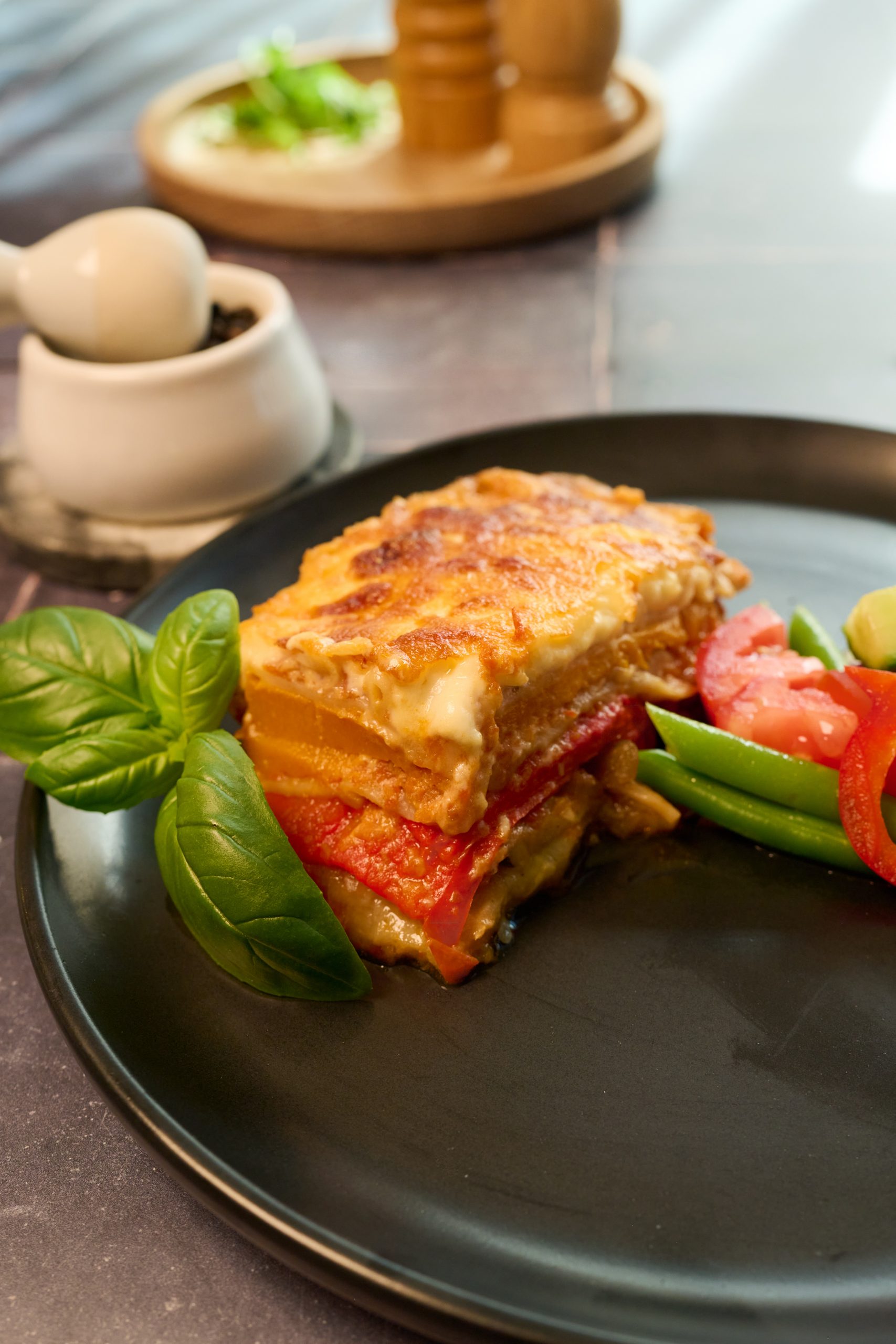 Roasted vegetable lasagne served with Plenty house salad and herby garlic bread (GFO available on request)