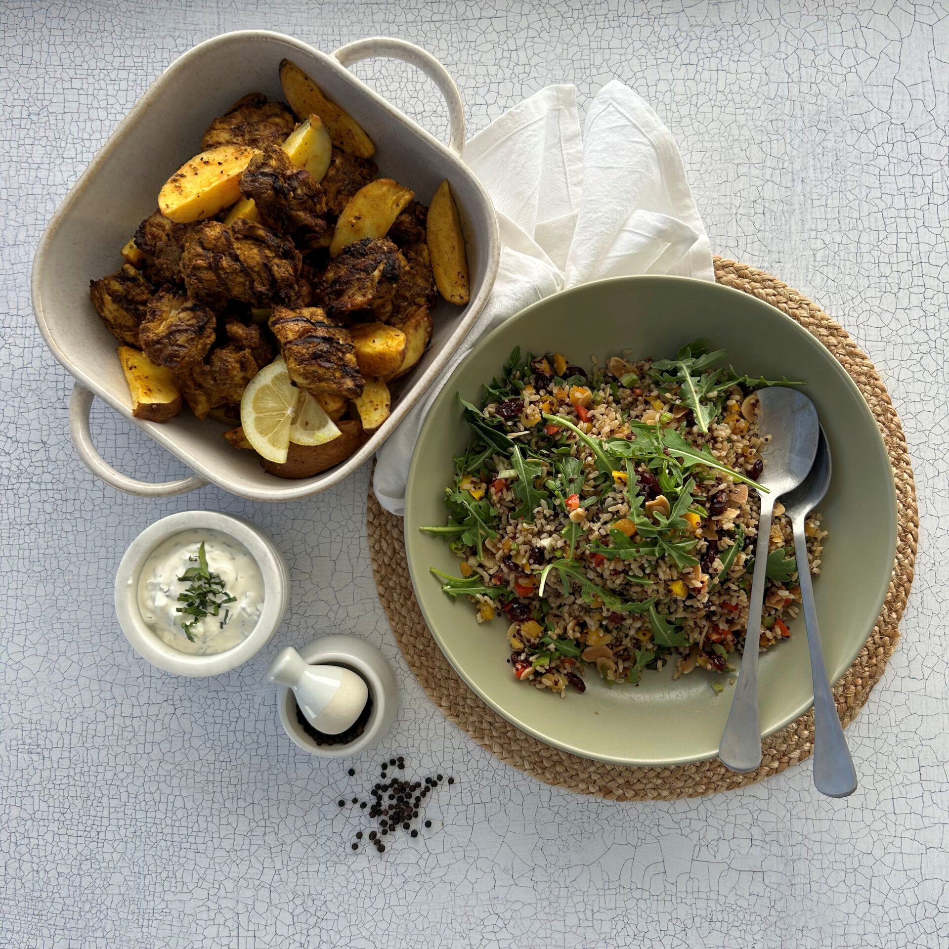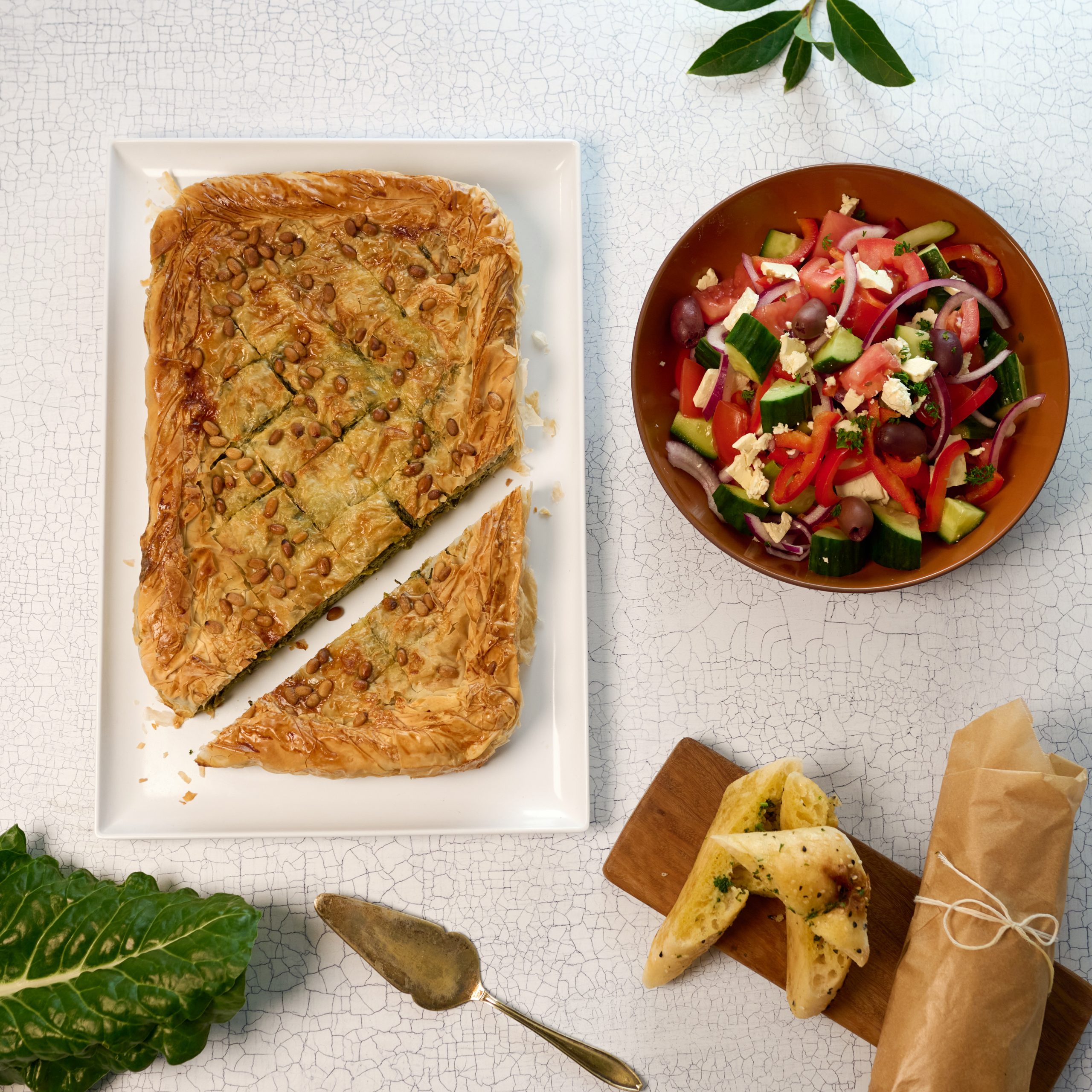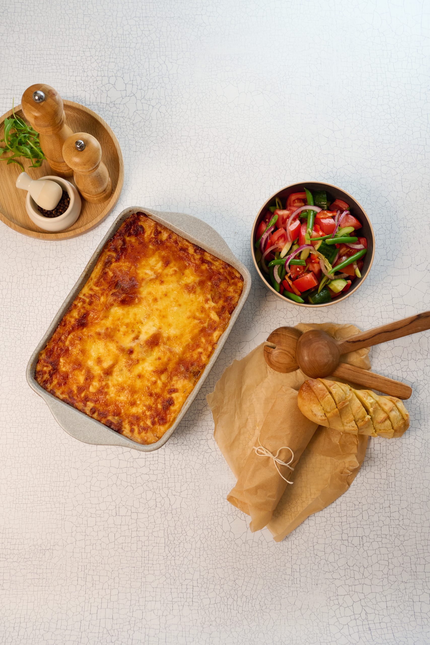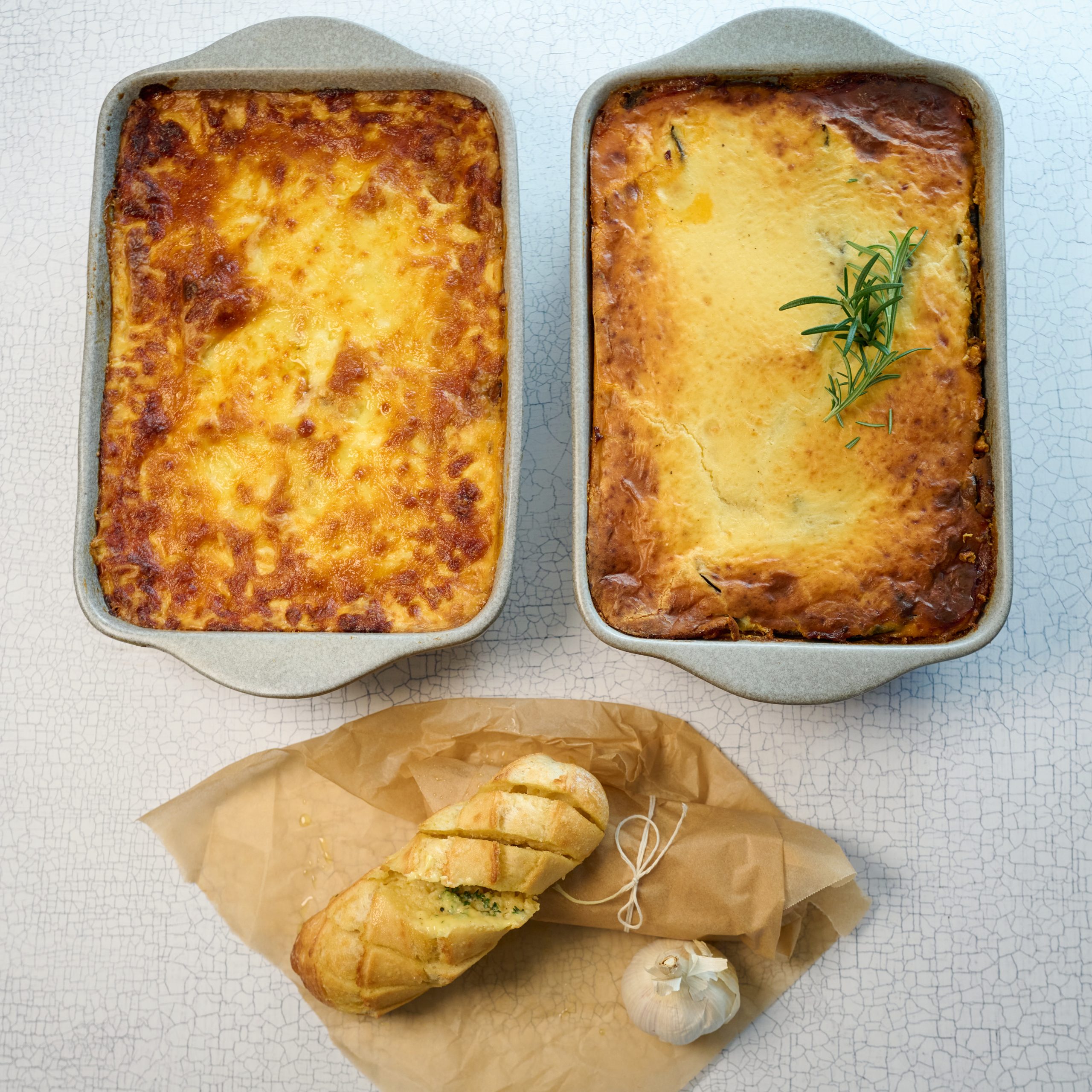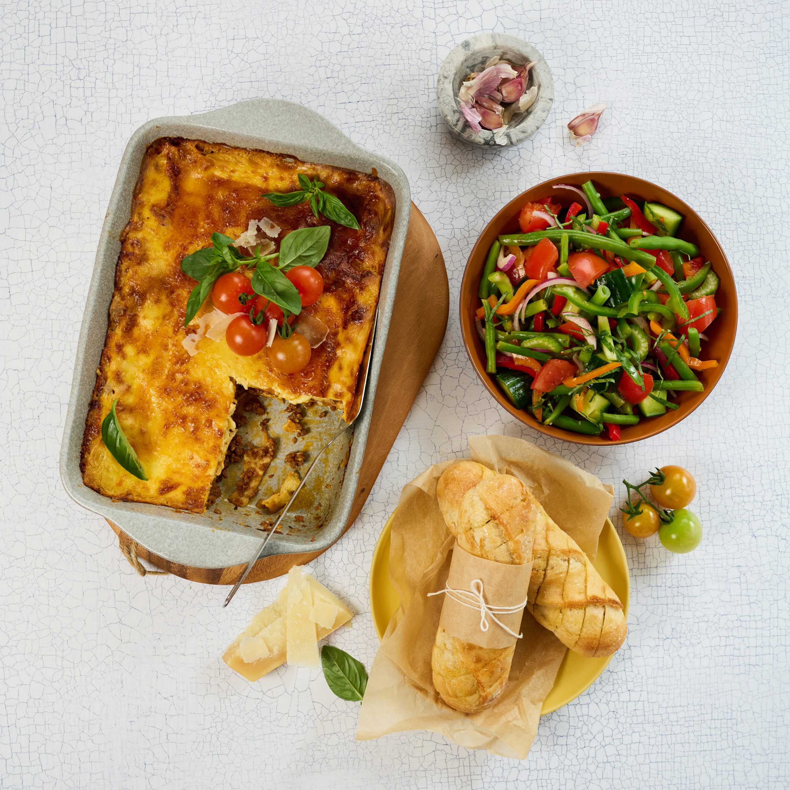 Roasted vegetable lasagne served with Plenty house salad and herby