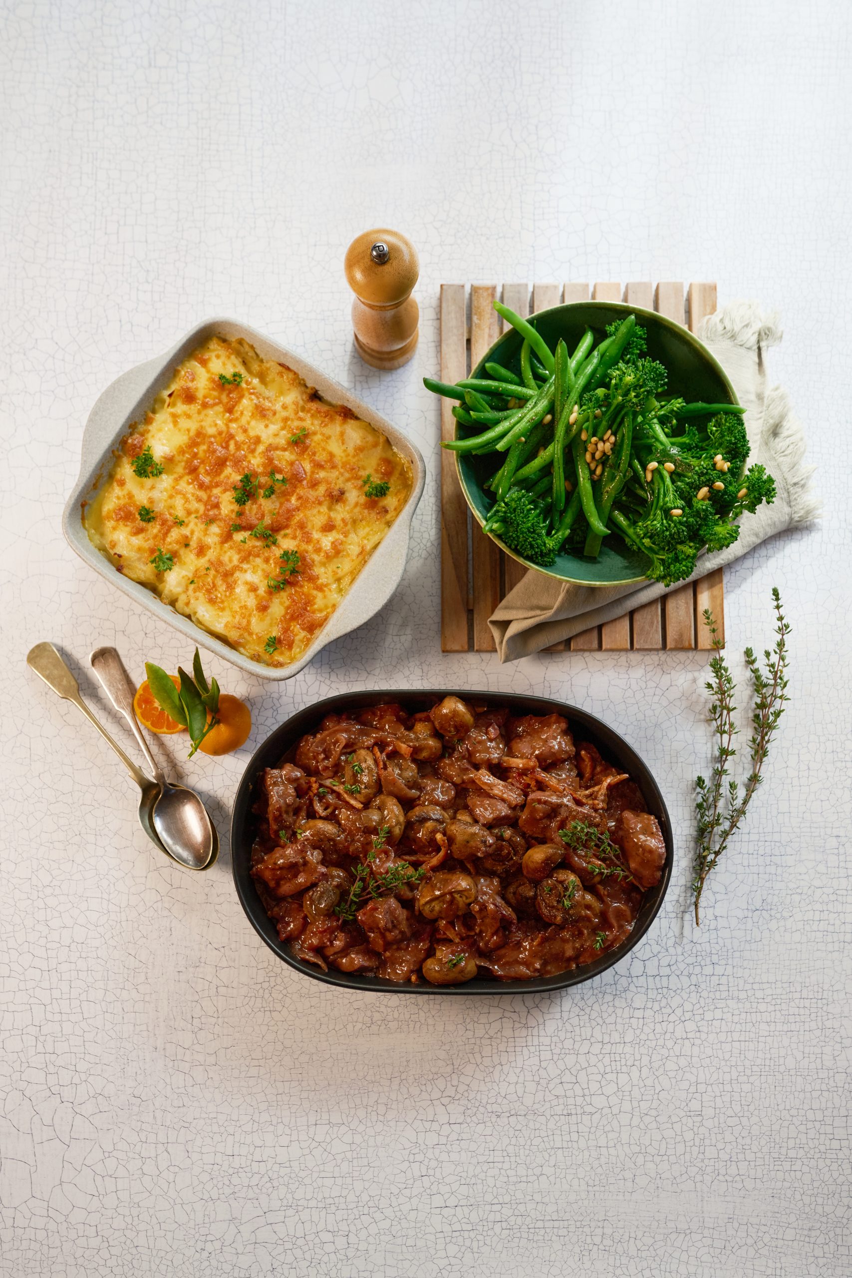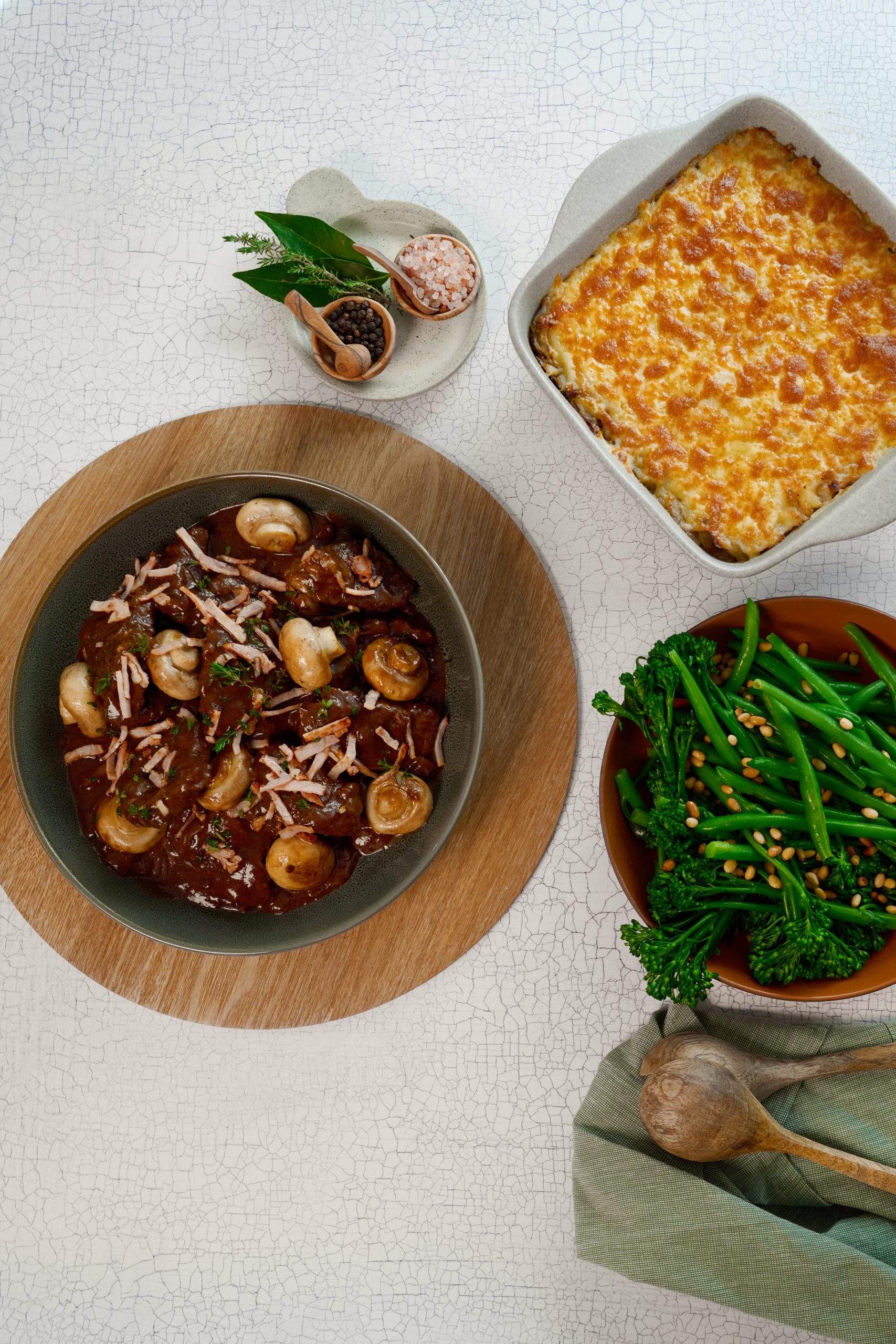 Boeuf Bourguignon served with creamy potato gratin and steamed broccolini